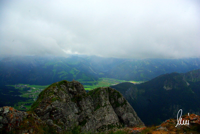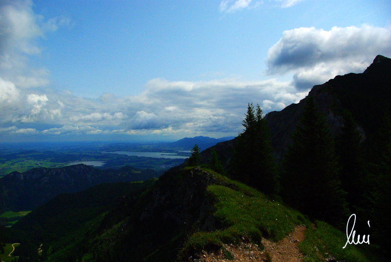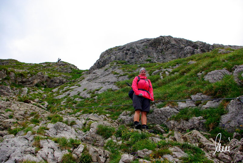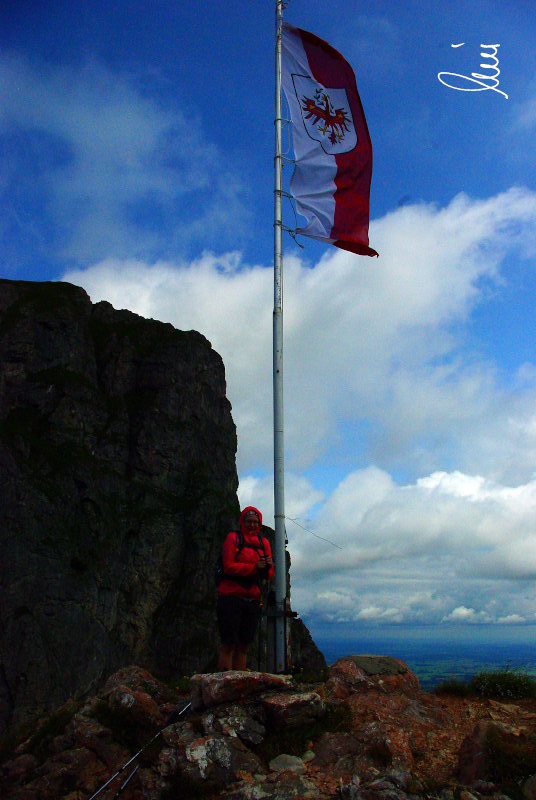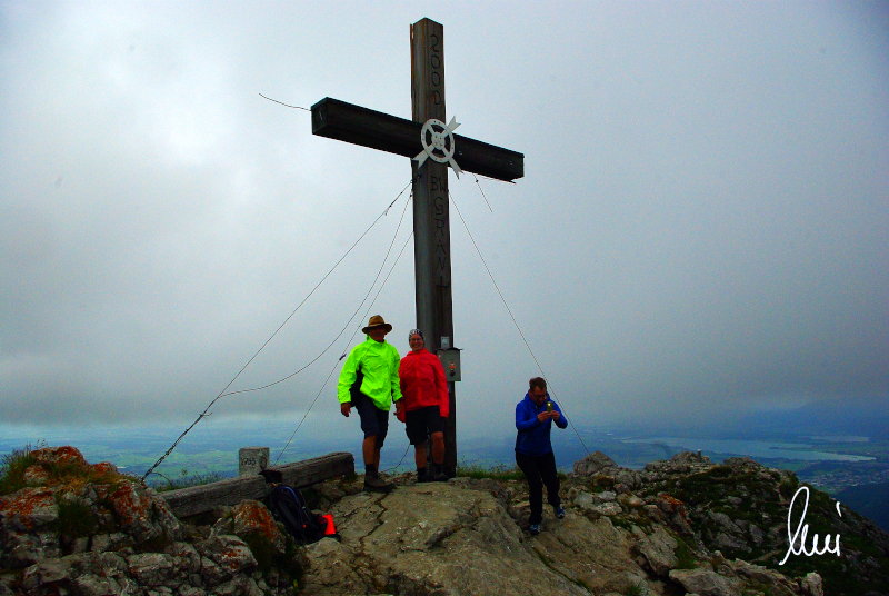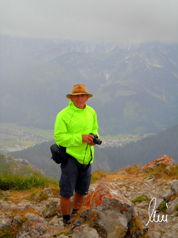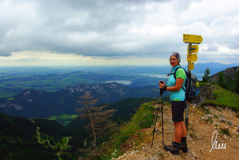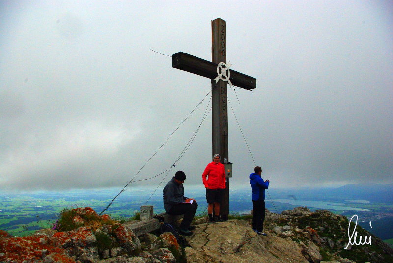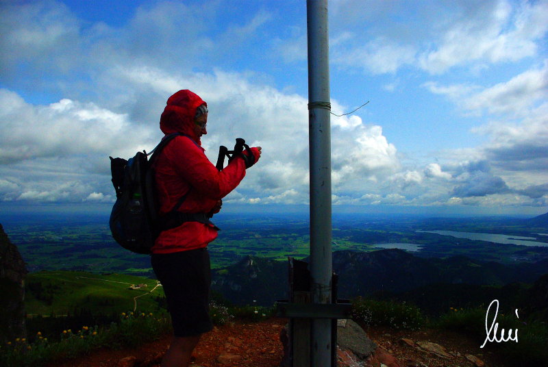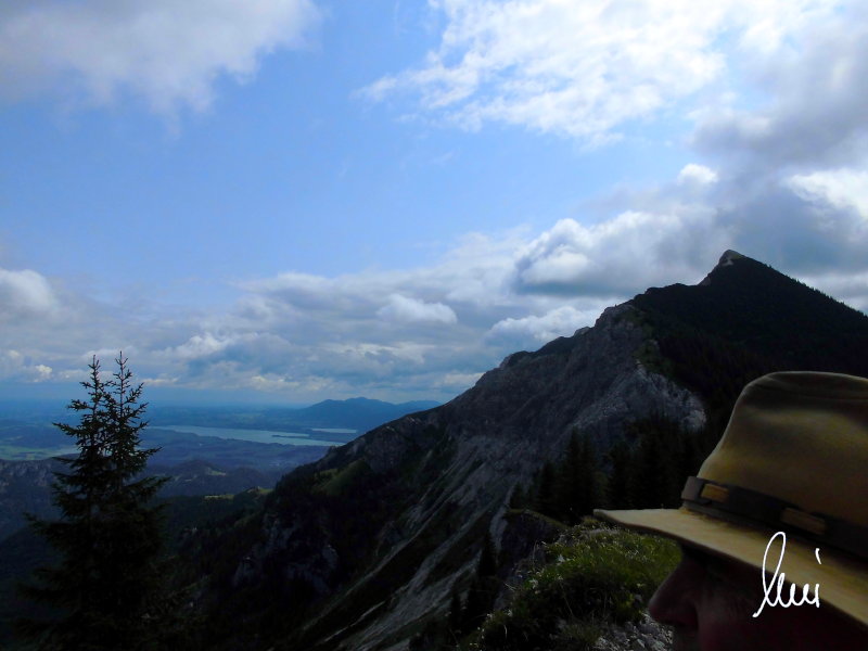 Am 9.7.2015 habe ich mit Verena den Aggenstein bestiegen. Die Tage vorher hatten Temperaturen bis 40 Grad geherrscht, natülich haben wir uns für die Tour etwas kältere Bedingungen gewunschen. Daß es natürlich so kalt werden würde, haben wir nicht gedacht. Schon vom Tal aus haben wir gesehen, daß an diesem Tag die Fernsicht doch ziemlich eingeschränkt sein würde. Daher haben wir schon mal alle Ziele verworfen die über 2000 m lagen. Eigentlich wollten wir entweder den gr. Widderstein oder Geishorn/Rauhorn besteigen. Die Wetterlage hat gar nichts anderes als den Aggenstein zugelassen. Da Verena den auch noch nicht bestiegen hatte, war die Wahl gar nicht so schlecht. Aber schon am Parkplatz sahen wir und gezwungen etwas wärmer anzuziehen, da doch ein recht kräftiger kalter Wind wehte. Der Aufstieg ging recht flott, weil einfach, nur das Wetter machte uns eben Sorgen. An der Hälfte, als wir das erste Mal über den Grad schauten, hat uns der kalte Westwind fast umgeblasen. Jetzt zog ich auch meine Regenjacke an, die ich bis kurz vor Schluss auch nicht mehr los wurde. Verena tapfer immer noch kurzärmelig. An der "Bad Kissinger Hütte" vorbei ging der Aufstieg bis zum Gipfel. Wir hatten beide blau angelaufene Finger, so kalt wars hier oben. Die ersten Leute haben wir am Gipfel getroffen, 2 Franken die in der Hütte übernachtet hatten. Lange konnten wir uns am Gipfel nicht aufhalten, an Brotzzeit machen war gar nicht zu denken. A bissel Guggen und fotografieren und dann wieder runter. Am Rückweg haben wir uns in der Hütte etwas aufgewärmt und Kaffee/Schokolade getrunken. Brotzeit gemacht haben wir erst auf halben Rückweg, als es nicht mehr so furchtbar zog. Allerdings hätte auch noch schlechter kommen können, denn es haben sich immer wieder Regenwolken rumgedrückt. Erst jetzt kamen uns mehr Wanderer entgegen, die das etwas bessere Wetter nutzten. allerdings ging immer noch der kalte Westwind nur etwas aufgeklart hatte es sich. Es hatte aber auch was gutes, so waren wir ziemlich ungestört und relativ früh wieder daheim. Vielleicht ergibt sich die nächsten Tage nochmal die Gelegenheit für eine "schöne" Tour bei dann schönerem Wetter. |