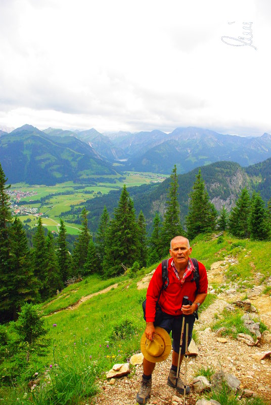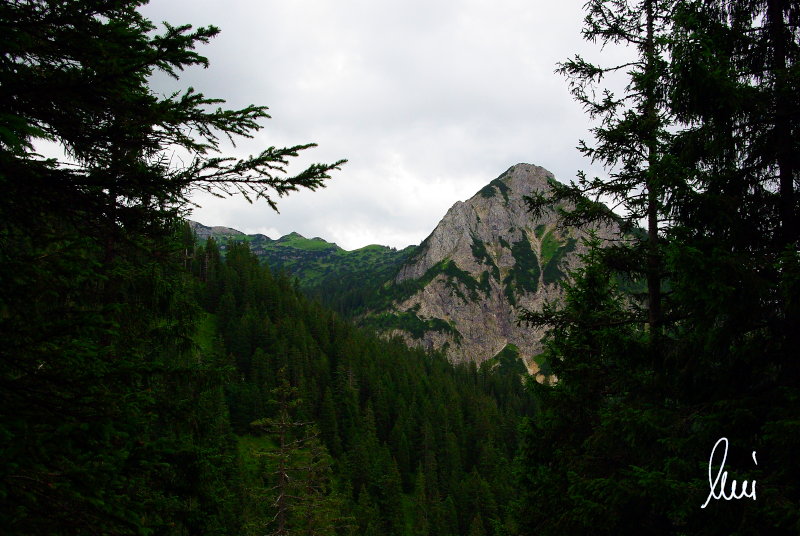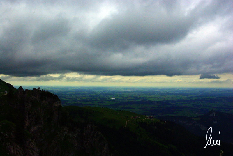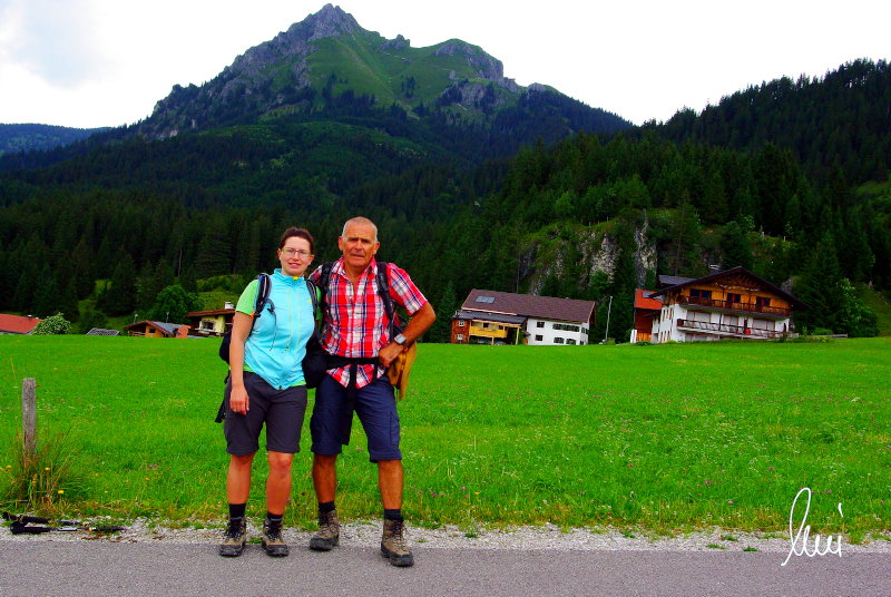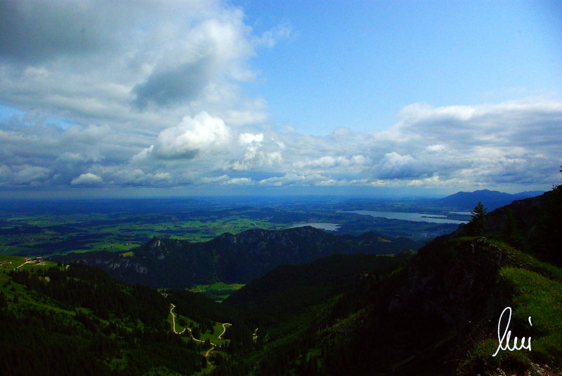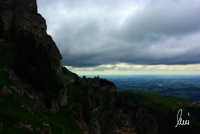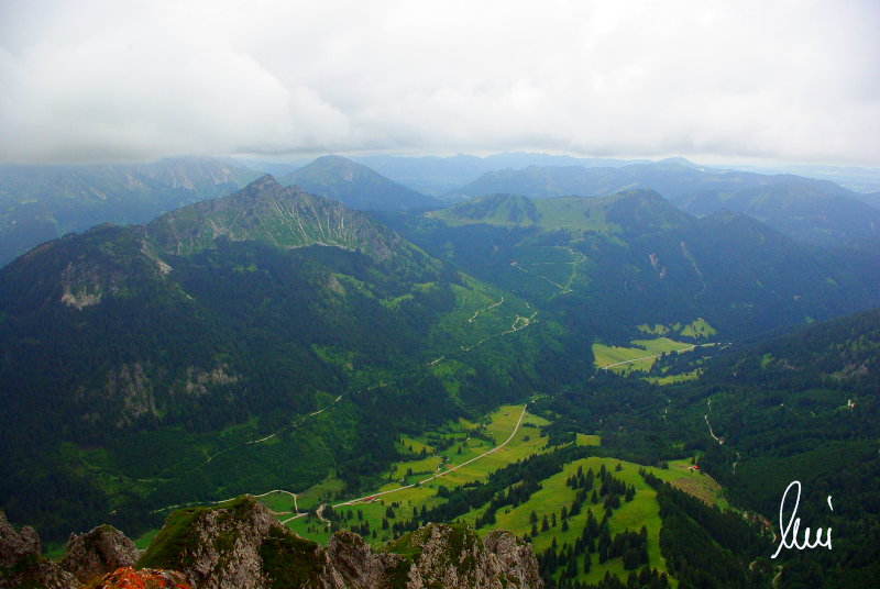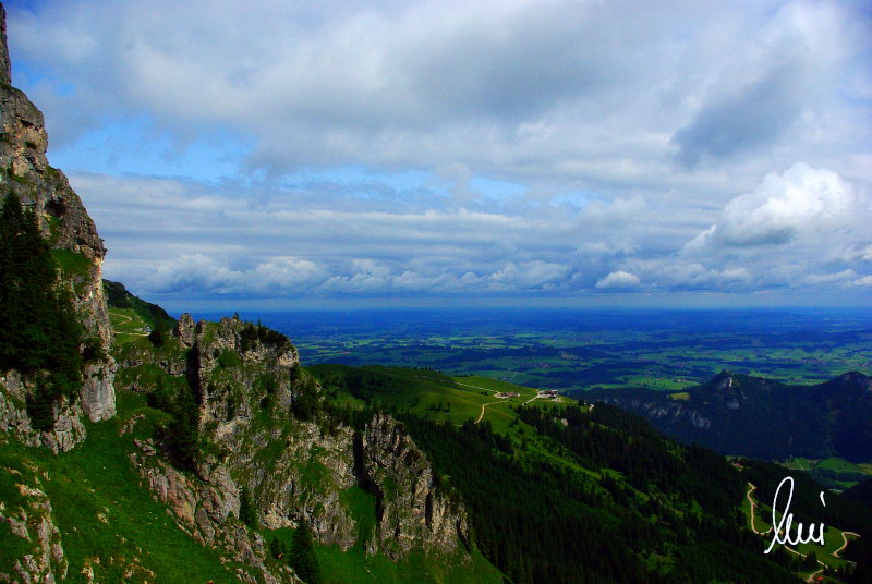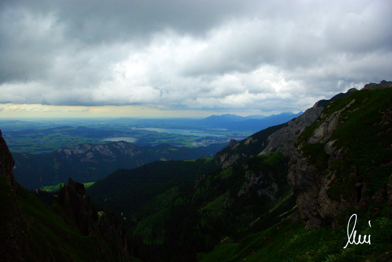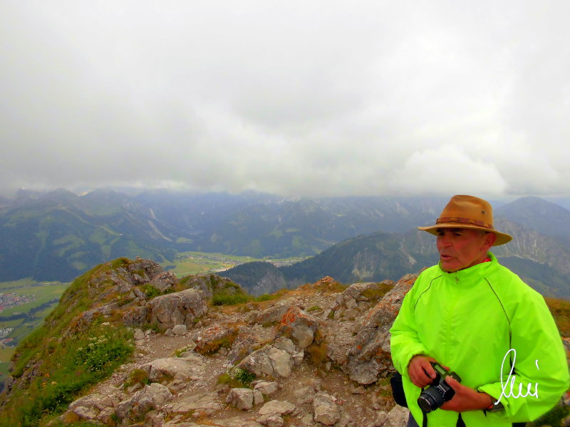 Am 9.7.2015 habe ich mit Verena den Aggenstein bestiegen. Die Tage vorher hatten Temperaturen bis 40 Grad geherrscht, natülich haben wir uns für die Tour etwas kältere Bedingungen gewunschen. Daß es natürlich so kalt werden würde, haben wir nicht gedacht. Schon vom Tal aus haben wir gesehen, daß an diesem Tag die Fernsicht doch ziemlich eingeschränkt sein würde. Daher haben wir schon mal alle Ziele verworfen die über 2000 m lagen. Eigentlich wollten wir entweder den gr. Widderstein oder Geishorn/Rauhorn besteigen. Die Wetterlage hat gar nichts anderes als den Aggenstein zugelassen. Da Verena den auch noch nicht bestiegen hatte, war die Wahl gar nicht so schlecht. Aber schon am Parkplatz sahen wir und gezwungen etwas wärmer anzuziehen, da doch ein recht kräftiger kalter Wind wehte. Der Aufstieg ging recht flott, weil einfach, nur das Wetter machte uns eben Sorgen. An der Hälfte, als wir das erste Mal über den Grad schauten, hat uns der kalte Westwind fast umgeblasen. Jetzt zog ich auch meine Regenjacke an, die ich bis kurz vor Schluss auch nicht mehr los wurde. Verena tapfer immer noch kurzärmelig. An der "Bad Kissinger Hütte" vorbei ging der Aufstieg bis zum Gipfel. Wir hatten beide blau angelaufene Finger, so kalt wars hier oben. Die ersten Leute haben wir am Gipfel getroffen, 2 Franken die in der Hütte übernachtet hatten. Lange konnten wir uns am Gipfel nicht aufhalten, an Brotzzeit machen war gar nicht zu denken. A bissel Guggen und fotografieren und dann wieder runter. Am Rückweg haben wir uns in der Hütte etwas aufgewärmt und Kaffee/Schokolade getrunken. Brotzeit gemacht haben wir erst auf halben Rückweg, als es nicht mehr so furchtbar zog. Allerdings hätte auch noch schlechter kommen können, denn es haben sich immer wieder Regenwolken rumgedrückt. Erst jetzt kamen uns mehr Wanderer entgegen, die das etwas bessere Wetter nutzten. allerdings ging immer noch der kalte Westwind nur etwas aufgeklart hatte es sich. Es hatte aber auch was gutes, so waren wir ziemlich ungestört und relativ früh wieder daheim. Vielleicht ergibt sich die nächsten Tage nochmal die Gelegenheit für eine "schöne" Tour bei dann schönerem Wetter. |