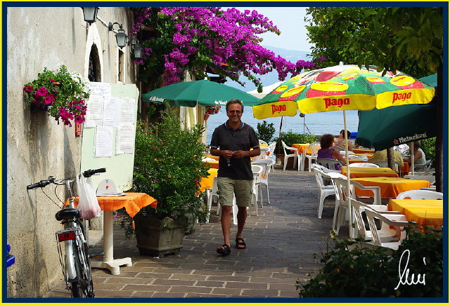 Bevor wir wieder Richtung Arbeit furhen, haben wir auch mal einen Erholungstag mit spätem Aufstehen, gemütlichem Frühstück und nur "bummeln" und Baden verbracht. Ich war eigentlich überrascht wie sauber der Gardasee eigentlich ist. Vor Jahren kann ich mich noch daran erinnern, war dies anders. Bei der Gelegenheit hat mir mein Alfred die Gegend an Westseite des Gardasee gezeigt und einwenig beschrieben. Was mir dabei aufgefallen ist, daß egal in welche Lokale wir gingen, alle Kellner und Chefs ihn scheinbar bestens gekannt haben. Am Ende des Tages waren wir dann noch bei mittlerweile auch meinem "Lieblingsitaliener" essen. |