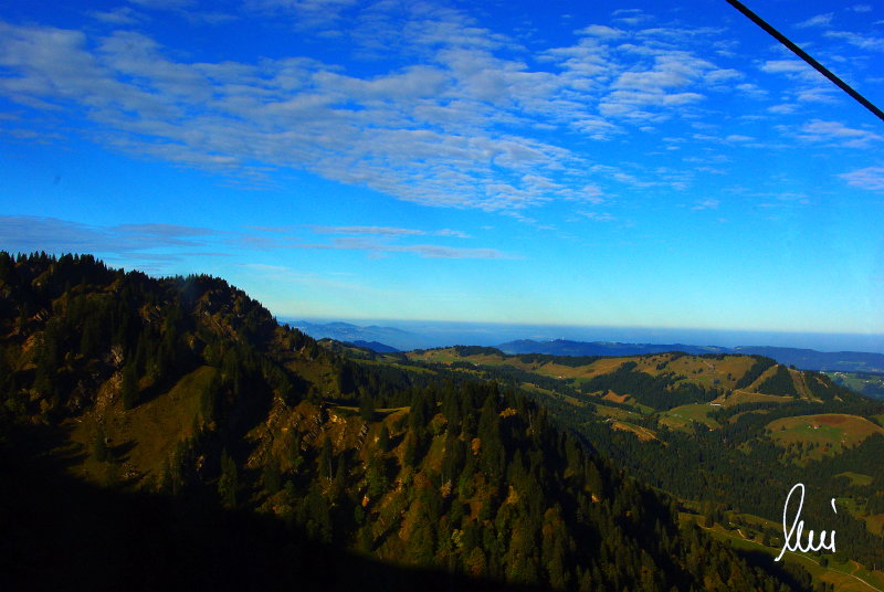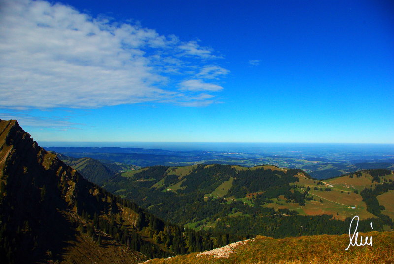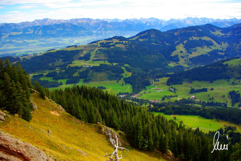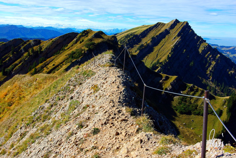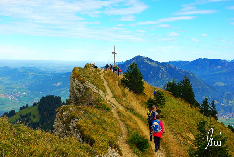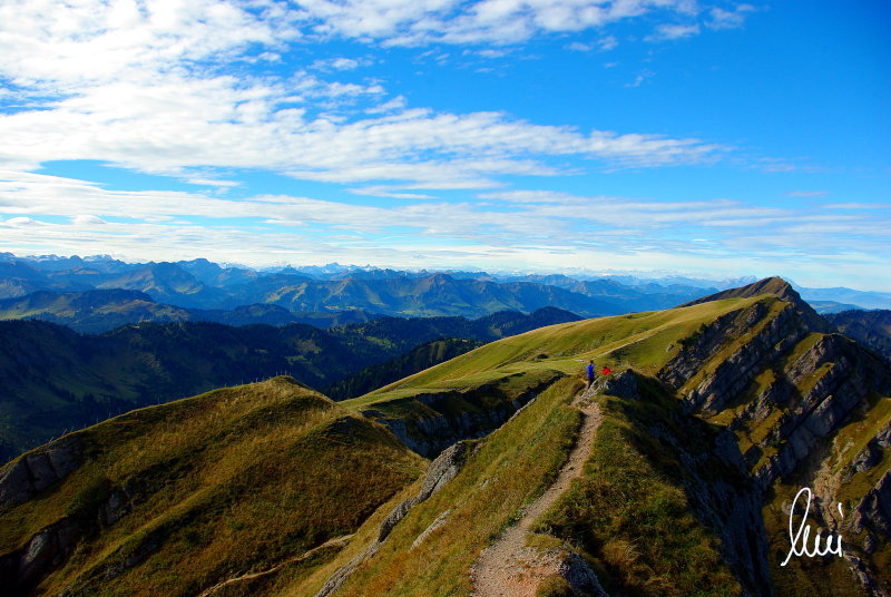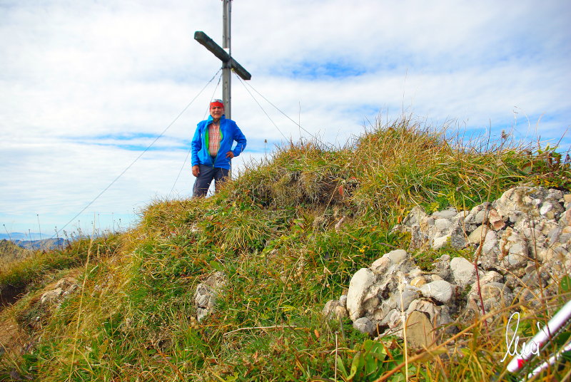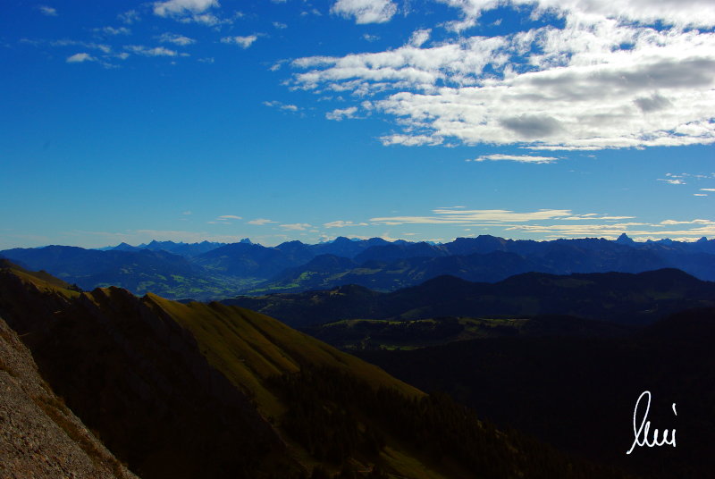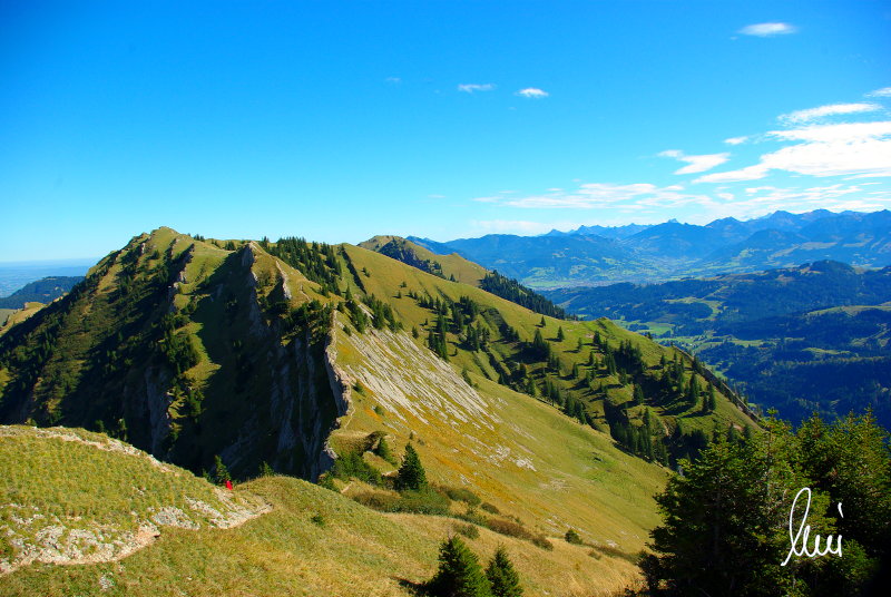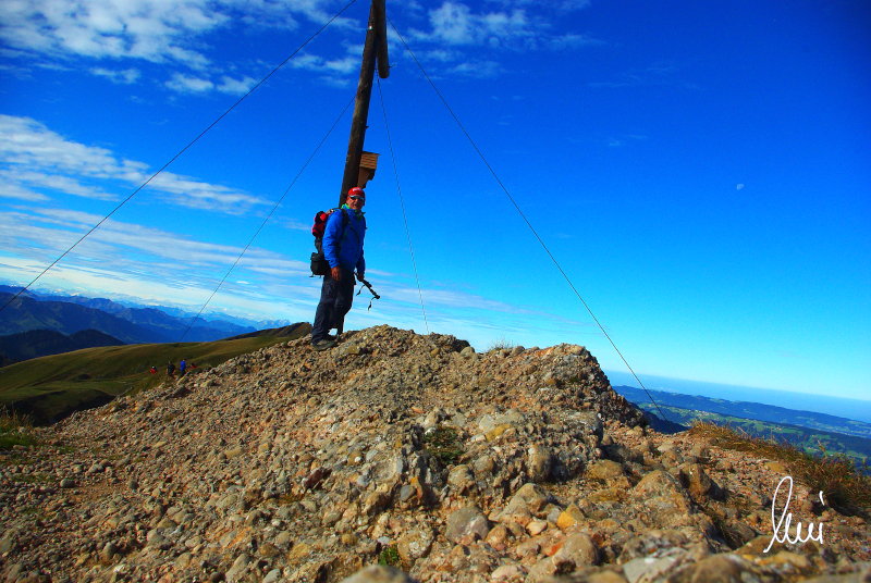 Nachdem alle meine Wanderpartner, durch Verletzungen oder Krankheit absagen mussten, hab ich mich allein auf den Weg gemacht. Nachdem in den Hauptalpen letzte Woche über 2000 m teilweise schon Schnee lag, hab ich mich entschlossen, die Nagelfluhüberschreitung anzugehen. Die wollte ich schon lange mal machen, denn man hat von dort oben einen gigantischen Ausblick über den Hautpalpenkamm. Das Wetter war bestens, tolle Fernsicht noch verhältnismäßig warm und vor allem trocken. Bisher habe ich, wenn ich sie von unten gesehen habe, immer gedacht, daß es reine Grasbuckel wären. Das täuscht aber ganz gewaltig, wenn sie auch nicht übermäßig hoch sind, sind doch relativ schwere Passagen drin, die absolute Trittsicherheit veraussetzen und man immer wieder die Hände nehmen muss. Auch eine riesen Leiter ist verbaut, die spektakulär aussieht. Die Tour ist auch relativ lang (15 km) und zieht sich über fast 1500 HM doch 6,5 Stunden hin. Ist also ziemlich anstrengend. Was noch hinzukommt, daß die Tour fast nicht abgebrochen werden kann und es wenig zu trinken gibt. Zwischendrin keine Hütten und keine Bäche zum Wasser auffüllen. Aber die aussicht entschädigt für alles. Das Auto habe ich in Immenstadt am Parkplatz abgestellt und bin dann mit dem ersten Zug und Bus über Oberstaufen und Steibis zur Hochgratbahn gefahren. Was besser war als anders herum. So hatte ich doch am Abend das Auto gleich zur Verfügung. |