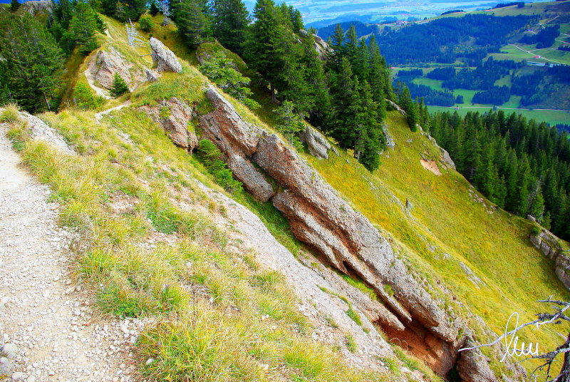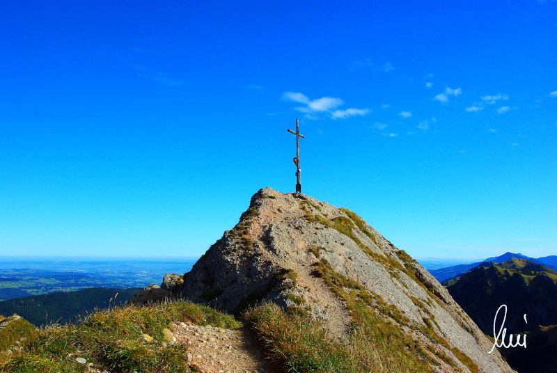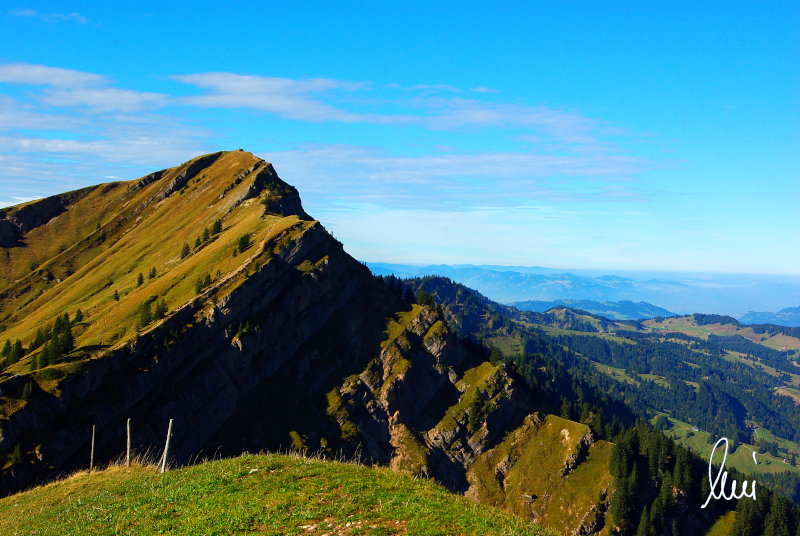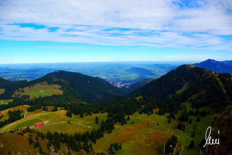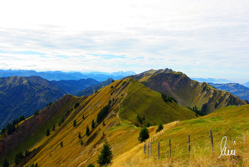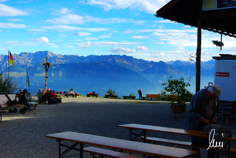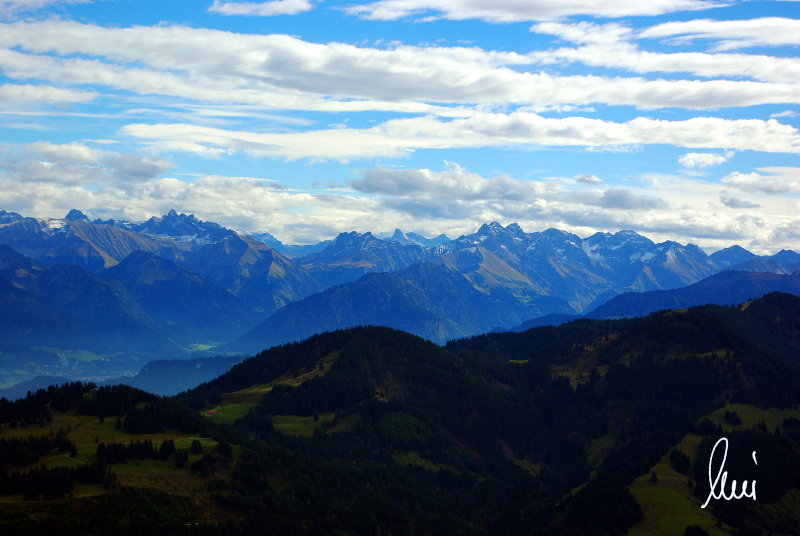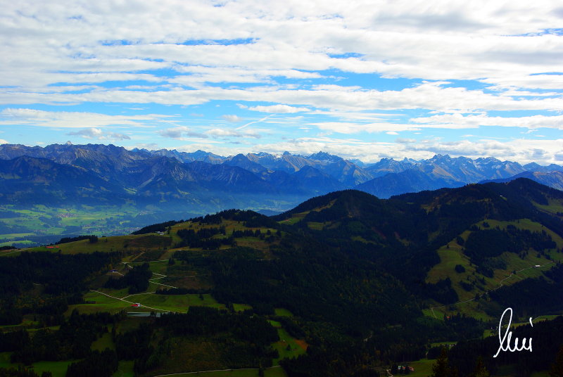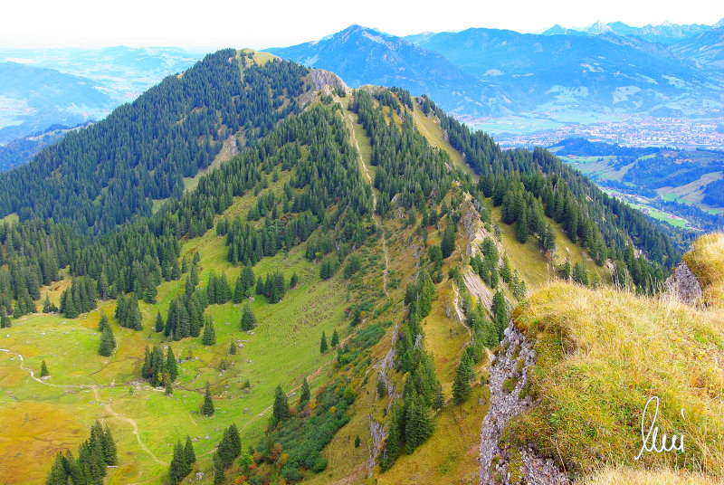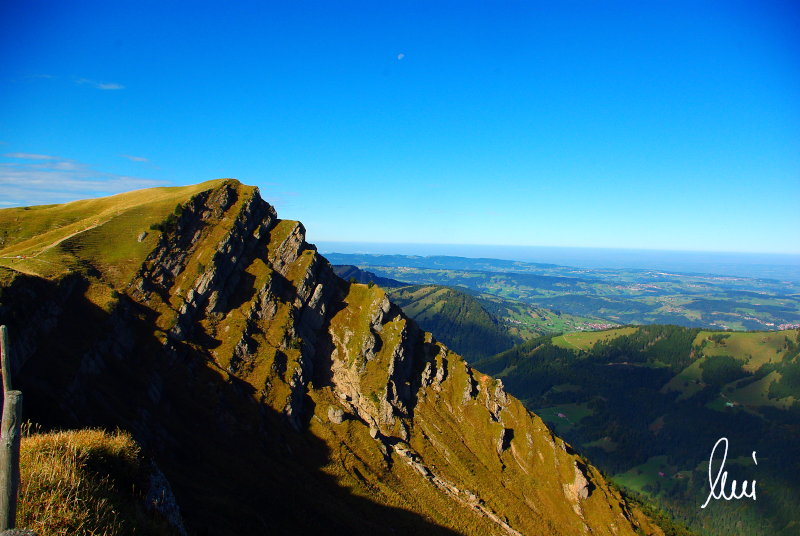 Nachdem alle meine Wanderpartner, durch Verletzungen oder Krankheit absagen mussten, hab ich mich allein auf den Weg gemacht. Nachdem in den Hauptalpen letzte Woche über 2000 m teilweise schon Schnee lag, hab ich mich entschlossen, die Nagelfluhüberschreitung anzugehen. Die wollte ich schon lange mal machen, denn man hat von dort oben einen gigantischen Ausblick über den Hautpalpenkamm. Das Wetter war bestens, tolle Fernsicht noch verhältnismäßig warm und vor allem trocken. Bisher habe ich, wenn ich sie von unten gesehen habe, immer gedacht, daß es reine Grasbuckel wären. Das täuscht aber ganz gewaltig, wenn sie auch nicht übermäßig hoch sind, sind doch relativ schwere Passagen drin, die absolute Trittsicherheit veraussetzen und man immer wieder die Hände nehmen muss. Auch eine riesen Leiter ist verbaut, die spektakulär aussieht. Die Tour ist auch relativ lang (15 km) und zieht sich über fast 1500 HM doch 6,5 Stunden hin. Ist also ziemlich anstrengend. Was noch hinzukommt, daß die Tour fast nicht abgebrochen werden kann und es wenig zu trinken gibt. Zwischendrin keine Hütten und keine Bäche zum Wasser auffüllen. Aber die aussicht entschädigt für alles. Das Auto habe ich in Immenstadt am Parkplatz abgestellt und bin dann mit dem ersten Zug und Bus über Oberstaufen und Steibis zur Hochgratbahn gefahren. Was besser war als anders herum. So hatte ich doch am Abend das Auto gleich zur Verfügung. |